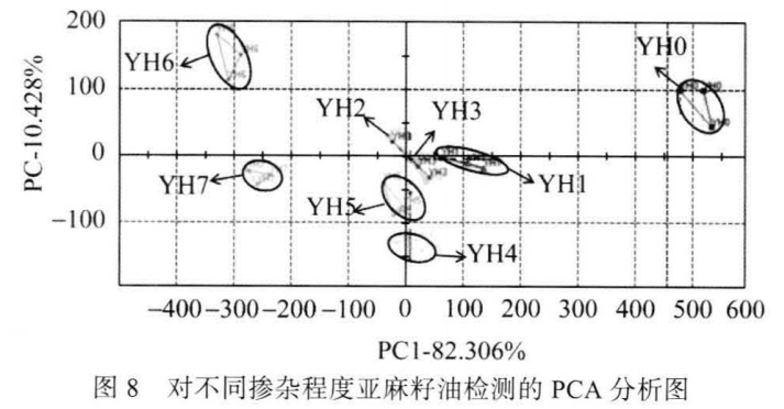 采用AlphaM.O.S公司的電子舌,對(duì)6種3組同類型、不同品牌、不同產(chǎn)地、不同生產(chǎn)工藝的油脂摻雜樣品進(jìn)行區(qū)分與識(shí)別,其檢測限可低至0.1%,識(shí)別指數(shù)為99分。相比于傳統(tǒng)的食用油摻假檢測,如油脂理化指標(biāo)檢測、氣相色譜法等,電子舌的檢測方法更靈敏,更準(zhǔn)確,并且可以區(qū)分成分相近的同種油脂,該檢測方法有助于食用油的地區(qū)保護(hù)、品牌保護(hù)。