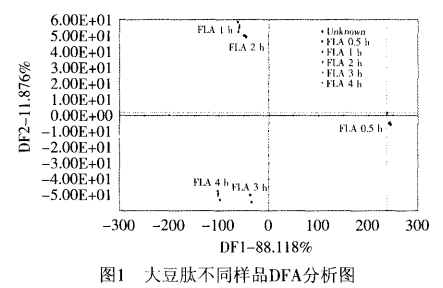 采用法國AlphaMOS電子舌對制取的五種不同酶解時間條件下的樣品進(jìn)行苦味特性研究。分別采用DFA模式識別方法和PLS預(yù)測模型對采集的數(shù)據(jù)進(jìn)行定性和定量分析,研究表明:采用DFA分析法能夠?qū)ξ宸N不同的大豆肽樣品的呈味特性和味覺相似程度進(jìn)行定性評價(jià),PLS模型能對未知樣品進(jìn)行呈味預(yù)測;大豆肽的苦味預(yù)測結(jié)果與實(shí)際感官評價(jià)吻合。研究結(jié)果為后續(xù)大豆肽產(chǎn)品的呈味特性研究提供一種新的方法途徑。