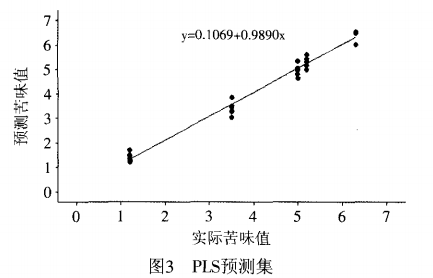 用PLS建立大豆肽溶液電子舌苦味預(yù)測模型,并對電子舌傳感器響應(yīng)值與人工感官評價(jià)得分值問的相關(guān)性進(jìn)行研究。以七根傳感器的響應(yīng)信號值為白變量,以感官得分值為因變量構(gòu)建偏最小二乘模型。建模集為60個樣本,驗(yàn)證集為30個樣本。結(jié)果如圖2、圖3所示,分別表示建模集、預(yù)測集的實(shí)際苦味值與預(yù)測值的相關(guān)圖。