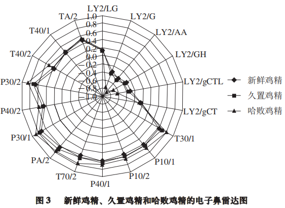 分別將新鮮雞精、久置雞精和哈敗雞精的電子鼻數(shù)據(jù)作雷達圖,對比結果如圖3所示。3 種雞精樣品被明顯地區(qū)分開來。哈敗雞精的風味輪廓明顯與新鮮雞精、久置雞精不同,傳感器T40/2、P30/2、P40/2、P30/1、PA/2、T70/2、P40/1、P10/2、P10/1、T30/1的響應值明顯大于新鮮雞精、久置雞精;傳感器LY2/gCTL、LY2/GH、LY2/AA、LY2/G的響應值由于是負值,哈敗雞精的響應信號則明顯低于新鮮雞精、久置雞精,說明哈敗雞精的響應值信號與新鮮雞精、久置雞精有較大差異,電子鼻分析得到新鮮雞精和久置雞精的風味輪廓更為接近,并與哈敗雞精有較大不同。
