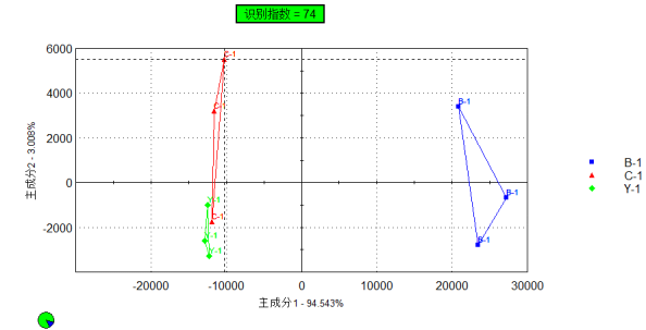 指紋分辨指數(shù)是根據(jù)主成分分析圖中的兩個樣品組間的相對距離計(jì)算得出,兩個樣品組間的距離越大,則兩個樣品組的指紋分辨指數(shù)越接近100%,即指紋分辨指數(shù)越大,樣品組間的區(qū)別越大。如表1所示,樣品B-1與Y-1間的指紋分辨指數(shù)較大,說樣品B-1與Y-1的差異較大,而樣品C-1與Y-1間的差異較小,即樣品C-1與Y-1間香氣更加接近。