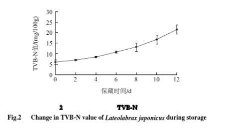 由上圖可知,保藏前4d TVB-N值上升比較緩慢,第4天開始上升加速,說明鱸魚品質(zhì)從第4天開始下滑較快;而由圖一感官得分的變化可知,從第2天開始鱸魚感官品質(zhì)明顯下降,說明在保藏初期鱸魚感官變化比TVB-N的變化更靈敏。第12天鱸魚的TVB-N值為21.6mg/100g,整個保藏過程中TVB-N值均為超過GB/T 18108-2008三級標(biāo)準(zhǔn)的要求(小于30mg/100g)。