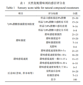 配制8%蔗糖溶液,以8%蔗糖溶液為基準(zhǔn),根據(jù)赤蘚糖醇、羅漢果甜苷、甜菊糖苷等倍甜比例(赤蘚糖醇:羅漢果甜苷=99.58:0.42,赤蘚糖醇:甜菊糖苷=99:0.05)進(jìn)行復(fù)配混合,配制與8%蔗糖溶液等甜度的天然復(fù)配糖。采用感官評分(感官表如表1所示)和電子舌檢測相結(jié)合的方式,確定與8%蔗糖溶液同等甜度的天然復(fù)配糖配方,通過算出8%蔗糖溶液與同等甜度天然復(fù)配甜味劑的溶質(zhì)質(zhì)量分?jǐn)?shù)之比,從而得出與4%、6%、10%、12%蔗糖溶液同等甜度的天然復(fù)配糖配方。