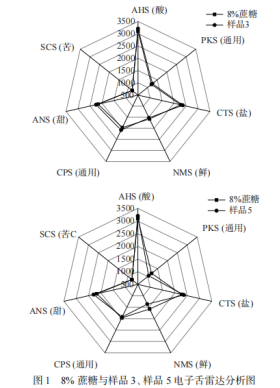 3.電子舌傳感器雷達(dá)圖分析,如圖1所示,得到樣品3和8%蔗糖溶液甜度相似。