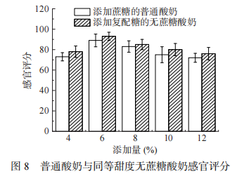 添加復(fù)配糖的無蔗糖酸奶和添加蔗糖的普通酸奶感官評分如圖8所示。添加6%蔗糖的普通酸奶感官評分89,同等甜度下添加復(fù)配糖的無蔗糖酸奶感官評分93,評分較其它濃度的酸奶高。同等甜度下,4%蔗糖和復(fù)配糖添加量過少不足以掩蓋酸奶發(fā)酵過程中的酸味,但組織狀態(tài)良好;同等甜度下,8%、10%、12%蔗糖和復(fù)配糖添加量過高,滋味過甜。添加量過高會影響到酸奶的凝乳效果,延長發(fā)酵時間,有少量乳清析出,出現(xiàn)組織狀態(tài)不好的現(xiàn)象。6%的添加量,酸奶酸甜可口,且發(fā)酵時間適宜,組織狀態(tài)均勻,滋味氣味良好。