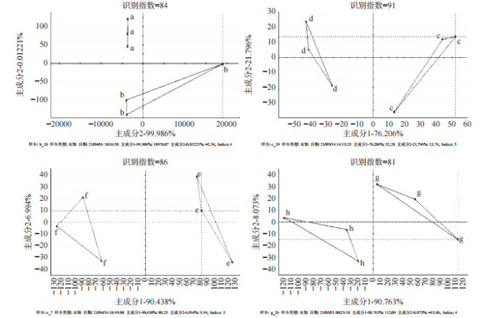 對不同濃度的兩種酸奶進(jìn)行電子舌檢測,并進(jìn)行味覺主成分分析。如圖10所示,濃度為4%、10%、12%同等甜度的兩種酸奶識別指數(shù)84、81、64均小于85,故此三個濃度下的兩種酸奶滋味不具有顯著性差異(P>0.05);而濃度為6%、8%同等甜度下的兩種酸奶識別指數(shù)分別為91、86均大于85,故兩個濃度下的兩種酸奶滋味具有顯著性差異(P<0.05)。