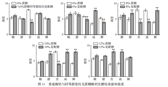 在滋味對比方面,不同濃度同等甜度下的兩種酸奶酸味、甜味、苦味、咸味、鮮味存在顯著性差異(P<0.05)(圖11)。添加復(fù)配糖的無蔗糖酸奶酸味強(qiáng)度值均比添加同等甜度蔗糖的普通酸奶大,但無顯著性差異(P>0.05)。蔗糖濃度為4%、6%普通酸奶的甜味強(qiáng)度值比添加同等甜度復(fù)配糖的無蔗糖酸奶甜味強(qiáng)度值大,蔗糖濃度為8%、10%、12%普通酸奶的甜味強(qiáng)度值小于添加同等甜度復(fù)配糖的無蔗糖酸奶。添加與12%蔗糖同等甜度復(fù)配糖的無蔗糖酸奶的苦味大于添加同等甜度蔗糖的普通酸奶,相同甜度的兩種酸奶在苦味、咸味、鮮味均存在顯著性差異(P<0.05)。濃度為4%、12%同等甜度下的兩種酸奶鮮味不存在顯著性差異(P>0.05),而濃度為6%、8%、10%同等甜度下的兩種酸奶鮮味存在顯著性差異(P<0.05)。