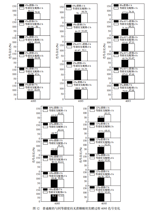 電子眼屬于視覺分析,模擬人眼對樣品的感知,分析樣品的整體顏色,以客觀數(shù)據(jù)展現(xiàn)出來。通過IRISVA400電子眼檢測添加復(fù)配糖的無蔗糖酸奶和添加蔗糖的普通酸奶發(fā)酵過程及發(fā)酵結(jié)束時顏色變化,如圖12所示。對占比最大的色號4095(乳白色)進(jìn)行分析,發(fā)酵結(jié)束時不同濃度下的兩種酸奶4095所占比例均超過75%。主成分分析結(jié)果如圖13所示,蔗糖濃度為4%、10%、12%的普通酸奶和添加同等甜度復(fù)配糖的無蔗糖酸奶相比,發(fā)酵結(jié)束時兩種酸奶識別指數(shù)分別為91、92、95,均大于85,說明此三個濃度下兩種酸奶色澤上具有顯著性差異(P<0.05)。而蔗糖濃度為6%、8%的普通酸奶與添加同等甜度復(fù)配糖的無蔗糖酸奶相比,識別指數(shù)分別是72、−2,均小于85,說明這兩個濃度下的兩種酸奶在色澤上無顯著性差異(P>0.05)。因此,酸奶的色澤和添加的蔗糖、復(fù)配糖濃度不呈線性關(guān)系,是酸奶的一種表觀體現(xiàn)。