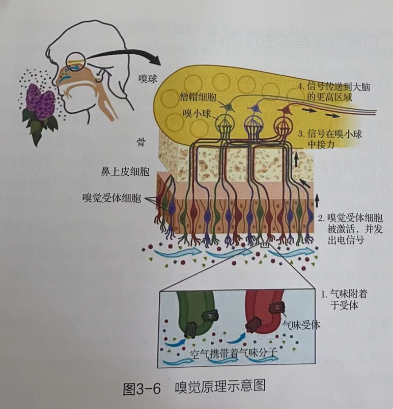 揮發(fā)性氣味物質在呼吸作用下進入鼻腔,首先進入嗅感區(qū)吸附和溶解在嗅黏膜表面,與嗅腺細胞的分泌物溶在一起,進而擴散至嗅毛,被嗅細胞所感受,嗅細胞表面電荷改變,Na﹢,K﹢等離子跨膜移動產生電流發(fā)出電信號,通過傳導神經以脈沖信號的形式傳遞,神經末梢產生興奮信號,經過大腦皮層嗅區(qū)信號處理分析后產生嗅覺(圖3-6)。