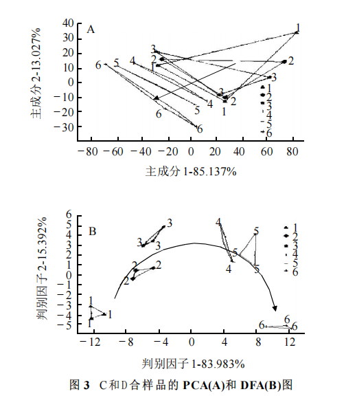 在圖3A 中,1 、2 、3 號(hào)樣品相互重疊而不能分開(kāi),其他 3 個(gè)樣品能夠很好地區(qū)分。沿著圖3A中箭頭所示的方向, 混合比例呈現(xiàn)一定規(guī)律的分布。在圖3B中,6 個(gè)不同混合比例的啤酒樣品相互之間能夠完全分開(kāi), 并且不同混合比例的啤酒樣品在 DFA 圖中的分布規(guī)律性更好。沿著圖中箭頭所示的方向,混合比例依次增加。從上述分析可以看出, 電子舌可以用于區(qū)分不同品牌啤酒的混合樣品。