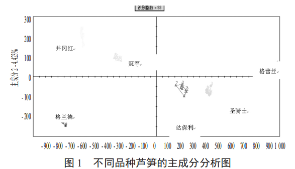圖 1 為 6 個不同品種蘆筍樣品的主成分 PCA 分析圖,第 1 主成分和第 2 主成分的總貢獻(xiàn)率達(dá)到了98.1%,足以收集特征信息。在圖 1 中,不同品種蘆筍分別聚類在 PCA 圖中的不同區(qū)域,相互之間能夠較好地區(qū)分。