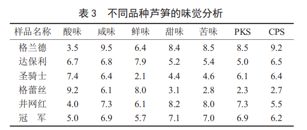 研究表明,6個不同品種的蘆筍水分含量差異較小,可溶性糖含量有所差異,格蘭德品種的可溶性糖含量較高,格蕾絲含量較小,這與電子舌味覺分析一致。格蘭德品種的咸味、甜味和苦味較大,酸味較??;格蕾絲的酸味和鮮味較大,甜味和苦味較小。達(dá)保利品種和圣騎士品種的相似性較大,格蘭德和格蕾絲的相似性最小。采用電子舌技術(shù)可以很好地區(qū)分不同品種蘆筍的味覺差異,還可以利用主成分分析明確地辨別不同品種之間的相似性大小。