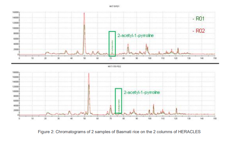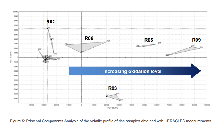 本研究表明,Heracles主成分分析可以在采集完樣品之后直接區(qū)分大米的氣味差異,同時(shí)此次實(shí)驗(yàn)還成功地用于快速比較幾種大米樣品中2-乙?;?1-吡咯啉的含量,以及氧化指標(biāo)(己醛)的含量。
