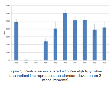 2-乙酰基-1-吡咯啉是巴斯馬蒂香米的主要特征香味化合物,從原始數(shù)據(jù)中可以看出,對(duì)比不同樣品,其含量的大小可比較。