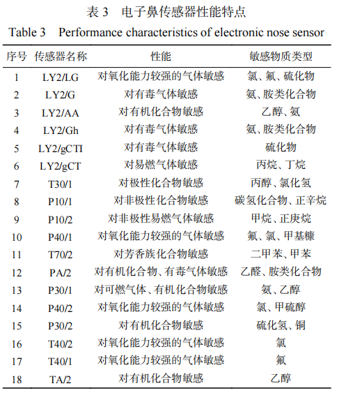 電子鼻分析 法國(guó)產(chǎn)電子鼻是通過(guò)MXT-5(弱極性)和MXT-7(中極性)色譜柱分離氣味物質(zhì),一共由18根金屬氧化傳感器組成,每根傳感器對(duì)應(yīng)一類或幾類物質(zhì)敏感,采用氫離子檢測(cè)器分析色譜信息,完成檢測(cè)后,即可使用儀器自帶數(shù)據(jù)庫(kù)對(duì)樣品揮發(fā)性物質(zhì)進(jìn)行定性、定量分析。電子鼻傳感器性能特點(diǎn)見(jiàn)表3。