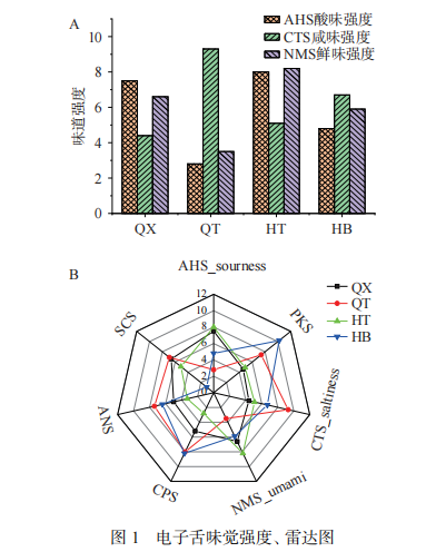 圖1A是電子舌味覺(jué)信號(hào)強(qiáng)度圖,可見(jiàn)酸味強(qiáng)度值(AHS):HT>QX>HB>QT,且樣品HT與樣品QT酸味強(qiáng)度值相差5.2,差異顯著;咸味強(qiáng)度值(CTS):QT>HB>HT>QX,且樣品QT與樣品QX咸味強(qiáng)度值相差4.9,差異明顯;鮮味強(qiáng)度值(NMS):HT>QX>HB>QT,且樣品HT與樣品QT鮮味強(qiáng)度值相差4.7,差異明顯。電子舌味覺(jué)信號(hào)強(qiáng)度差異表明牦牛肉不同部位滋味差異明顯。