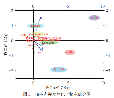 揮發(fā)性化合物數(shù)據(jù)歸一化處理后,進(jìn)行主成分分析。圖5顯示PC1貢獻(xiàn)率86.70%,PC2貢獻(xiàn)率6.92%,表明主成分經(jīng)降維后數(shù)據(jù)能反映原數(shù)據(jù)整體信息;其中,苯甲醛、壬醛、2-乙酰吡咯、2-乙基-1-己醇、間二甲苯相對(duì)含量突出,構(gòu)成牦牛肉的主要化合物;樣品HT中苯甲醛(帶有堅(jiān)果香氣)、2-乙酰吡咯(烤堅(jiān)果的風(fēng)味)相對(duì)含量較高,可以確定牦牛肉后腿帶有堅(jiān)果風(fēng)味,燒烤后風(fēng)味獨(dú)特;而樣品QX、HB、QT風(fēng)味化合物主要構(gòu)成是壬醛、間二甲苯、2-乙基-1-己醇,位置相對(duì)較近,判斷風(fēng)味相似。
