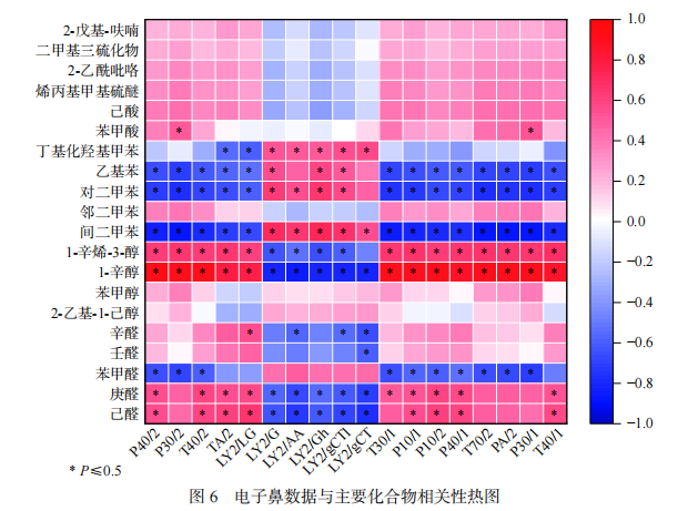 研究表明,取每個(gè)類別、相對(duì)含量前五揮發(fā)性化合物做相關(guān)性熱圖,可以辨別兩個(gè)數(shù)據(jù)之間的關(guān)聯(lián)性和差異性。電子鼻傳感器數(shù)據(jù)是宏觀化合物解析、SPME-GC-MS是具體化合物相對(duì)含量,因此有一定的相關(guān)性。采用Pearson相關(guān)性分析,將電子鼻傳感器數(shù)據(jù)與SPME-GC-MS相對(duì)含量較高的主要數(shù)據(jù),歸一化處理后,進(jìn)性相關(guān)性分析。r代表反映X軸、Y軸的線性相關(guān)程度,|r|越大相關(guān)性越強(qiáng),|r|越小相關(guān)性越弱(r值在-1~1之間),P≤0.5表示顯著,其結(jié)果如圖6所示。