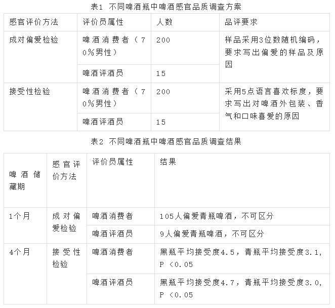 綜合分析兩種檢驗方法,在貯藏期1個月內(nèi),消費者和啤酒評價員檢驗結(jié)果表明,兩種啤酒瓶中啤酒不存在顯著偏愛差異;但經(jīng)過4個月的自然老化后,黑瓶內(nèi)啤酒接受度更高,可能是因為黑瓶的抗氧化能力更強。