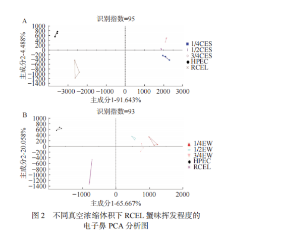 當真空濃縮體積分別濃縮至原體積的3/4、1/2、1/4時,停止旋轉蒸發(fā)過程,得到CES,同時收集EW,分別記為3/4CES、1/2CES、1/4CES;3/4EW、1/2EW、1/4EW。最后將3/4CES、1/2CES、1/4CES;3/4EW、1/2EW、1/4EW以及RCEL進行電子鼻PCA分析。
