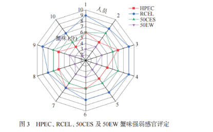 香氣感官評定 隨機選擇10名經(jīng)過感官評定培訓的人員,對制備的HPEC、RCEL、50CES和50EW蟹味強弱進行評定,蟹味濃,取7~10分;蟹味稍濃,取4~7分;蟹味較淡,取0~4分。