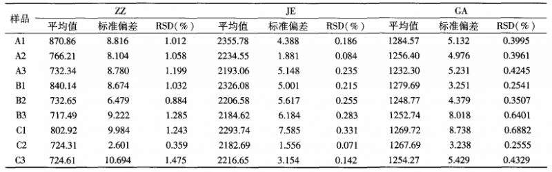 表 1表 示 各 傳 感 器 對 樣 品 的判 別 指 數(shù) ,而 判 別 指 數(shù) JE >ZZ>GA>JB,可 見 傳 感 器 響 應(yīng) 強(qiáng) 度 與 對 樣 品 的 差 異 判 別 能 力 不 是 線 性 關(guān) 系 ,如 ZZ雖 響 應(yīng) 強(qiáng) 度 較 小 但 對 咖 啡 樣 品 有 較 高 的 差 異 判 別 指 數(shù) ,經(jīng) 過 判 別 指 數(shù) 和 響 應(yīng) 強(qiáng) 度 綜 合 確 定 傳 感 器 為 JE、GA 和 ZZ。傳 感 器 對 咖 啡 樣 品 響 應(yīng) 強(qiáng) 度 值 、標(biāo) 準(zhǔn) 偏 差 和 相 對 標(biāo) 準(zhǔn) 偏 差 (RSD) 見 表 2。