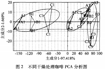 PCA 分 析 能 較 好 的 區(qū) 分 樣 品 ,主 成 分 1的 貢 獻(xiàn) 率 高 達(dá) 97.418% ,主 成 分 2的 貢 獻(xiàn) 率 為 1.669% 。三 組 實(shí) 驗(yàn) 均 能 較 好 區(qū)分 樣 品 ,且 樣 品 2與 樣 品 3之 間 的距 離 遠(yuǎn) 小 于 樣 品 1與 樣 品 3之 間 的 距 離 ,說 明 熱 風(fēng) 干 燥 會 造 成 咖 啡 風(fēng) 味 變 化 ,其 與 太 陽 光 自然 風(fēng) 味 相 差 較 遠(yuǎn) ,半 熱 風(fēng) 干 燥 半 自然 干 燥 雖 也 會 造 成 風(fēng) 味 變 化 ,但 與 太 陽 光 自然 干 燥 風(fēng) 味 相 差 不 大 。說 明 半 熱 風(fēng) 干 燥 半 自然 干 燥 是 咖 啡 在 惡 劣 環(huán) 境 下 ,咖 啡 濕 豆 干 燥 有 效 的 補(bǔ) 充 。