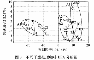 電 子 舌 能 夠 較 好 的 區(qū) 分 不 同 干 燥 處 理 方 式 的 咖 啡 ,主 成 分 1的 貢 獻(xiàn) 率 及 判 別 因 子 1的 貢 獻(xiàn) 率 , 均 達(dá) 到 90% 以 上 ,PCA 分 析 與 DFA 分 析 證 明 結(jié) 論 一致 ,說 明 兩 種 分 析 方 式 對 咖 啡 樣 品 均 具 有 良 好 的 區(qū)分 。