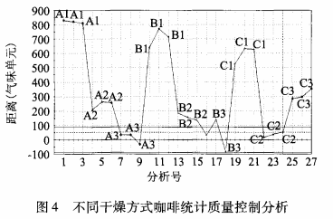 咖 啡 濕 豆 干 燥 通 常 以 太 陽 光 自然 干 燥 為 主 ,該 實(shí) 驗(yàn) 以 太 陽 光 自然 干 燥 為 參 照 對 象 ,由 于 三 組 重 復(fù) , 均 有 自然 干 燥 。此 采 用 A3為 標(biāo) 準(zhǔn) 進(jìn) 行 SQC分 析 ,經(jīng) 電 子 舌 檢 測 得 出 圖 4。