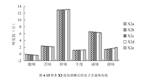 完成鮮味的調(diào)配后,由圖4-11可知樣本X2在甜味上仍與W有一定差距,因此X在添加了MSG的基礎(chǔ)上需要進一步提升甜味。在X2中分別添加0.1, 0.2, 0.3, 0.4,0.5 g/100ml的蔗糖,依次命名為X2a, X2b, X2c, X2d, X2e,測試得滋味響應如圖4-13所示。由圖可見,隨著糖濃度的升高,樣品的酸味、苦味和咸味有不同程度的下降,而甜味逐漸升高。