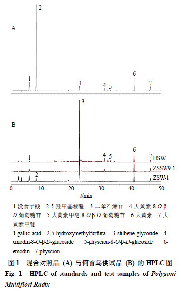 2.2.7  重復(fù)性試驗 取制何首烏粉末(ZSW-1)約1 g,精密稱定,共6份,按“2.2.3”項下方法制備供試品溶液,分別精密吸取10 μL,注入液相色譜儀,按“2.2.1”項下色譜條件測定,記錄峰面積并計算各成分含量,結(jié)果沒食子酸、5-羥甲基糠醛、二苯乙烯苷、大黃素-8-O-β-D-葡萄糖苷、大黃素甲醚-8-O-β-D-葡萄糖苷、大黃素、大黃素甲醚含量的RSD分別為0.33%、0.92%、0.08%、1.65%、1.67%、1.59%、1.90%,表明該方法重復(fù)性良好。