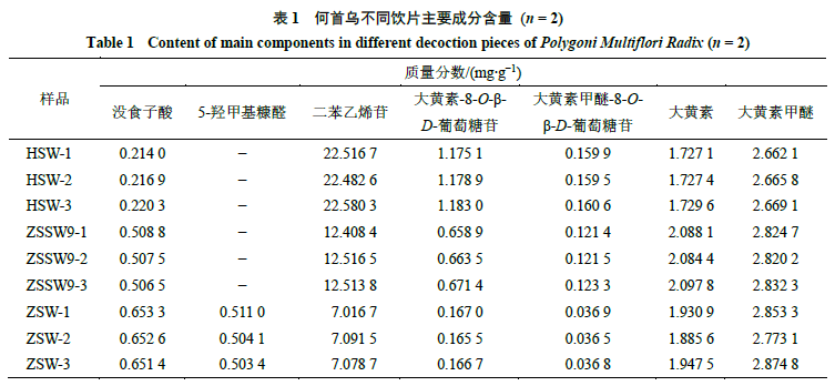 2.2.9  樣品測定  分別稱取生何首烏、九蒸九曬何首烏、藥典法制何首烏飲片適量,按“2.2.3”項下方法制備供試品溶液,每個樣品平行2次,按“2.2.1”項下色譜條件進(jìn)行測定,記錄峰面積并計算各成分含量,結(jié)果見表1。含量測定結(jié)果表明,何首烏不同飲片中均含有沒食子酸、二苯乙烯苷、大黃素-8-O-β-D-葡萄糖苷、大黃素甲醚-8-O-β-D-葡萄糖苷、大黃素、大黃素甲醚6種成分,但不同飲片間各成分含量存在一定差異。九蒸九曬、藥典法制何首烏中沒食子酸及蒽醌苷元類成分的含量與生何首烏相比,均有不同程度的增加,其中以沒食子酸含量增加最為顯著,藥典法制何首烏約為生品的3倍,九蒸九曬何首烏約為生品的2倍。炮制為制何首烏后,苷類(二苯乙烯苷、蒽醌苷)成分含量顯著減少,與生何首烏相比,九蒸九曬何首烏中二苯乙烯苷含量減少了約44%,蒽醌苷類成分含量減少了約41%;藥典法制何首烏中二苯乙烯苷含量減少了約69%,蒽醌苷類成分含量減少了約85%;而5-羥甲基糠醛僅在藥典法制何首烏飲片中檢出,平均質(zhì)量分?jǐn)?shù)為0.506 1 mg/g。