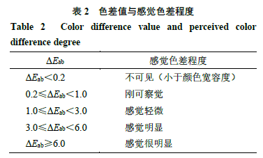 電子眼采用的色彩系統(tǒng)中L*代表明度指數(shù),a*(紅-綠軸)、b*(黃-藍(lán)軸)代表顏色對立維度。對于樣品1、2,ΔL*L1*L2*,為正值時樣品1顏色偏淺,為負(fù)值時樣品1顏色偏深。Δa*a1*a2*,為正值時樣品1顏色偏紅,為負(fù)值時樣品1顏色偏綠。Δb*b1*b2*,為正值時樣品1顏色偏黃,為負(fù)值時樣品1顏色偏藍(lán)。樣品顏色可用色度值(Eab*)表示,計算公式為Eab*=(L*2a*2b*2)1/2。2個樣品之間的色差為ΔEab,計算公式為ΔEab=(ΔL*2+Δa*2+Δb*2)1/2,色差值與人眼感覺色差程度的關(guān)系見表2。