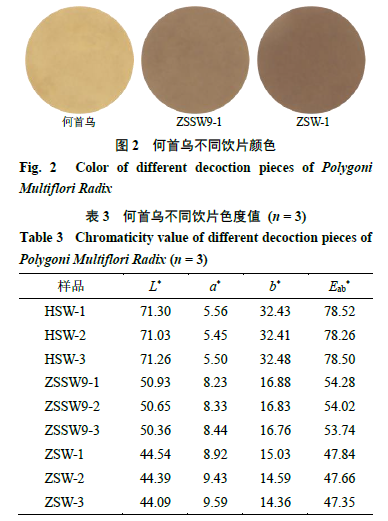 2.3.2何首烏不同飲片顏色比較 觀察各樣品顏色,可見何首烏不同飲片顏色差異明顯,結(jié)果見圖2。何首烏不同飲片樣品色度值比較見表3。經(jīng)電子眼測定,九蒸九曬何首烏與生何首烏的ΔEab>6.0,顏色色差感覺很明顯,兩者ΔL*為負(fù),Δa*為正,Δb*為負(fù);藥典法制何首烏與生何首烏的ΔEab>6.0,顏色色差感覺很明顯,兩者ΔL*為負(fù),Δa*為正,Δb*為負(fù),說明經(jīng)九蒸九曬及藥典法炮制后何首烏飲片顏色均變深變紅變藍(lán);藥典法制何首烏與九蒸九曬何首烏的ΔL*為負(fù),Δa*為正,Δb*為負(fù),說明藥典法制何首烏飲片較九蒸九曬何首烏飲片顏色變化程度更深。
