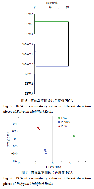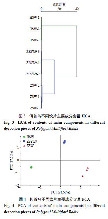 為了進(jìn)一步分析何首烏飲片物質(zhì)基礎(chǔ)與顏色的相關(guān)性,本實驗對測定的7種主要化學(xué)成分含量與顏色特征值進(jìn)行了多元統(tǒng)計分析,HCA和PCA結(jié)果顯示古今方法炮制的何首烏飲片可各自聚為一類,且與生何首烏相比,古、今方法炮制的何首烏飲片可聚為一類,進(jìn)一步驗證了九蒸九曬法與藥典法制何首烏飲片的個性特征及共性規(guī)律。沒食子酸及蒽醌苷元含量與何首烏飲片顏色變深呈正相關(guān),二苯乙烯苷及蒽醌苷含量與何首烏飲片顏色變深呈負(fù)相關(guān)。因此,可通過快速無損的顏色檢測,實現(xiàn)對何首烏飲片炮制工藝的控制及飲片質(zhì)量的客觀評價。本實驗從物質(zhì)基礎(chǔ)與顏色變化的相關(guān)性角度對古代經(jīng)典九蒸九曬炮制方法與現(xiàn)代藥典收載的制何首烏炮制方法進(jìn)行了對比研究,結(jié)果顯示,2種方法炮制的制何首烏飲片雖然在外觀性狀的主觀評價上具有較高的相似性,但通過現(xiàn)代智能感官分析技術(shù)的客觀表征和主要藥效物質(zhì)的分析,可以初步證明古今2種方法炮制的制何首烏飲片是2種獨立的藥效載體,傳統(tǒng)經(jīng)典炮制方法存在的合理性不僅有其悠久臨床應(yīng)用歷史的佐證,也有現(xiàn)代科學(xué)技術(shù)對其科學(xué)內(nèi)涵的闡釋,二者不具有替代性。進(jìn)一步系統(tǒng)開展2種炮制方法的藥效學(xué)研究,將為全面分析何首烏古今炮制方法,解決何首烏炮制工藝不規(guī)范、質(zhì)量不穩(wěn)定等問題,提高何首烏臨床應(yīng)用的安全性和有效性提供新的依據(jù)。