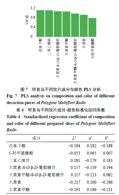 根據(jù)PLS模型的回歸系數(shù)(表4),沒食子酸、大黃素、大黃素甲醚的含量與L*、b*值呈負(fù)相關(guān),與a*值呈正相關(guān);5-羥甲基糠醛的含量與L*值呈負(fù)相關(guān),與a*、b*值呈正相關(guān);二苯乙烯苷、大黃素-8-O-β-D-葡萄糖苷、大黃素甲醚-8-O-β-D-葡萄糖苷的含量與L*b*值呈正相關(guān),與a*值呈負(fù)相關(guān)。提示沒食子酸、大黃素、大黃素甲醚這3種成分與何首烏飲片變深、變紅、變藍(lán)有關(guān),與炮制后何首烏飲片顏色總體變化相一致;二苯乙烯苷、大黃素-8-O-β-D-葡萄糖苷、大黃素甲醚-8-O-β-D-葡萄糖苷這3種成分與何首烏飲片變淺、變綠、變黃有關(guān),與炮制后何首烏飲片顏色總體變化相反。