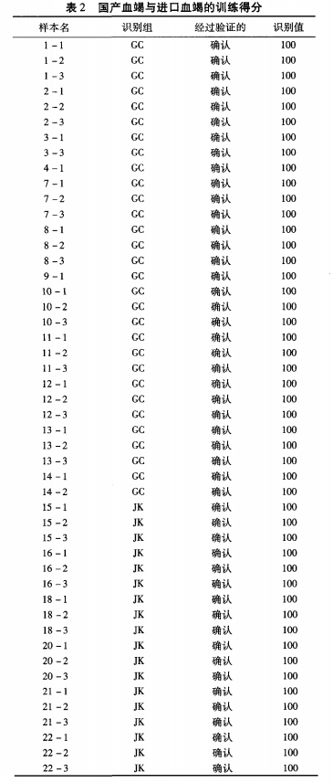 如圖 1所示 ,電子鼻將國(guó)產(chǎn)血竭樣品與進(jìn)口血竭樣品分成了兩個(gè)區(qū)域 ,紅色區(qū)域?yàn)閲?guó)產(chǎn)血竭 ,兩種不同的血竭樣品的差別主要表現(xiàn)在判別因子 1(100),進(jìn)口血竭落在了Y軸的左側(cè) ,國(guó)產(chǎn)血竭落在了Y軸的右側(cè)。訓(xùn)練得分表明所用樣品均經(jīng)過確認(rèn) ,且識(shí)別值均為 100分 。由 DFA判別模型可基本知曉國(guó)產(chǎn)血竭和進(jìn)口血竭在氣味上有著一定的區(qū)別 。訓(xùn)練得分如表 2所示。