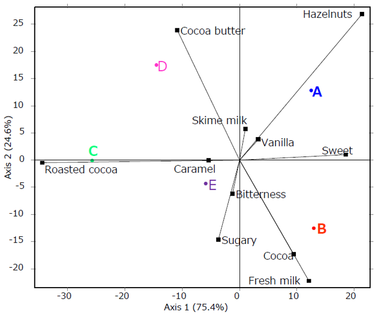 通過TDS持續(xù)時(shí)間生成的主成分分析圖:A,B,C,D,E 這幾個(gè)樣品都有不同的感官特征,比如A產(chǎn)品的榛子味濃一些,C產(chǎn)品的烤可可味更濃一些。