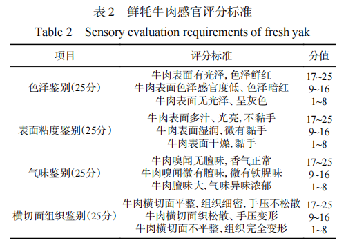 感官評價 參考GB/T22210-2008《國家肉與肉制品感官評定規(guī)范標準》鑒定標準,隨機選取10位烹飪營養(yǎng)與教育專業(yè)學(xué)生組成評定小組,先期進行感官評價培訓(xùn),內(nèi)容包括:肉類色澤鑒別、肉類表面粘度鑒別、肉類氣味鑒別、肉類橫切面組織鑒別。然后在專業(yè)感官品評實驗室對樣品進行感官評價。評分標準見表2。