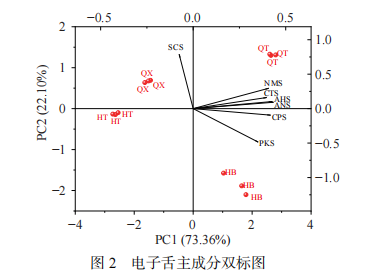 圖2顯示主成分PC1貢獻率為73.36%、PC2貢獻率為22.10%,表明主成分降維后數(shù)據(jù)能反映原數(shù)據(jù)的整體信息,四個樣品分布在四個象限中,無重疊,表明樣品之間存在較明顯差異性。主成分雙標圖貢獻影響因子在圖中以線段表示,越靠近樣品所在坐標軸,說明影響因子對其影響越大。樣品HT最靠近X軸,且樣品HT與QX相近,滋味相似;樣品HB距離其他樣品較遠,位于第四象限,其滋味差異主要體現(xiàn)在PC1上;結(jié)果表明,電子舌能明顯區(qū)分四個部位樣品,且樣品之間滋味差異明顯。