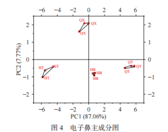 如圖4所示:四個部位樣品能夠獨立區(qū)分出來,說明電子鼻能夠辨別樣品氣味特征,且PC1貢獻率為87.06%、PC2貢獻率為7.77%,說明大量有效信息存在于第一主成分。可以判斷,樣品HT、HB、QT氣味特征相近,樣品QX氣味特征與其他部位差異較大。