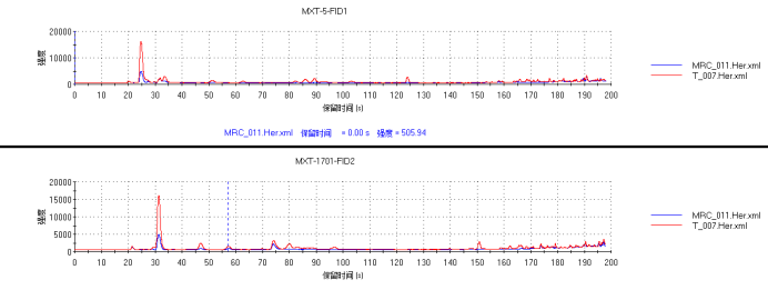 疊加2個(gè)樣品的色譜圖進(jìn)行觀察,兩種牛奶樣品的色譜圖有比較明顯的差別,例如20s至40s處。