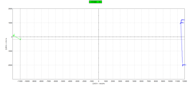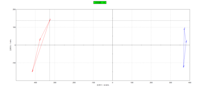 PCA是將采集到的氣味成分的種類和含量作為變量,通過向量變化以更直觀的形式體現(xiàn)樣品間的氣味組成差異,圖2為原始PCA圖(以所有色譜峰為變量)。第一主成分(PC1)與 第二主成分(PC2)的貢獻(xiàn)率之和達(dá)到了 99.6141%,能較為完整的代表樣品的全部信息;樣品間的差異主要反應(yīng)在橫軸上距離的遠(yuǎn)近(第一主成分貢獻(xiàn)率顯著 93.823%)。2個(gè)樣品在主成分分析圖上的區(qū)分指數(shù)達(dá)到(Discrimination Index)99,說明超快速氣相色譜電子鼻(Heracles)能夠基于氣味的差異,有效區(qū)分2個(gè)牛奶樣品。