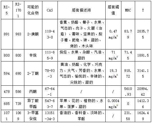 根據(jù)表2,樣品T和樣品MRC之間的差異性化合物的含量是樣品T>樣品MRC,其中含量明顯差異的化合物可能是2-庚酮、辛烷2-丁酮、丙酮、異丁酸甲酯、3-甲基癸烷。