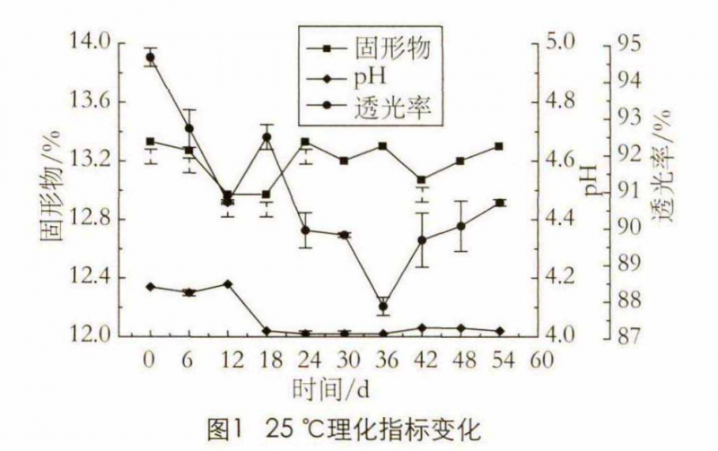 由圖1可知:25 °C下隨著儲(chǔ)藏時(shí)間的延長(zhǎng),可溶性固形物含量維持在12.87%? 13.23%,整體趨勢(shì)變化幅度不大。pH在第 18天降低為3.56,過低的pH會(huì)影響格瓦斯的風(fēng)味與口感。隨著儲(chǔ)藏時(shí)間不斷延長(zhǎng),透光率從初始94.68%出現(xiàn)明顯下降,第 18天為9 2 . 5 2 % ,第24天降低為90.07%。根據(jù)實(shí)驗(yàn)可知,當(dāng)透光率降到% %以下時(shí),飲料色澤會(huì)變差、出現(xiàn)細(xì)小渾濁,因此設(shè)定透光率低于90 % 的儲(chǔ)藏時(shí)間為貨架期終點(diǎn)。目卩25 °C時(shí)青稞格瓦斯貨架期為24 d。