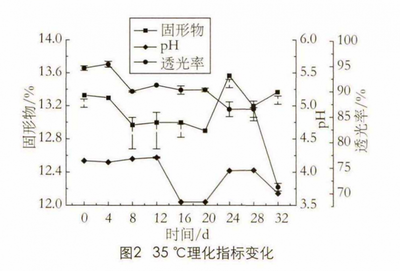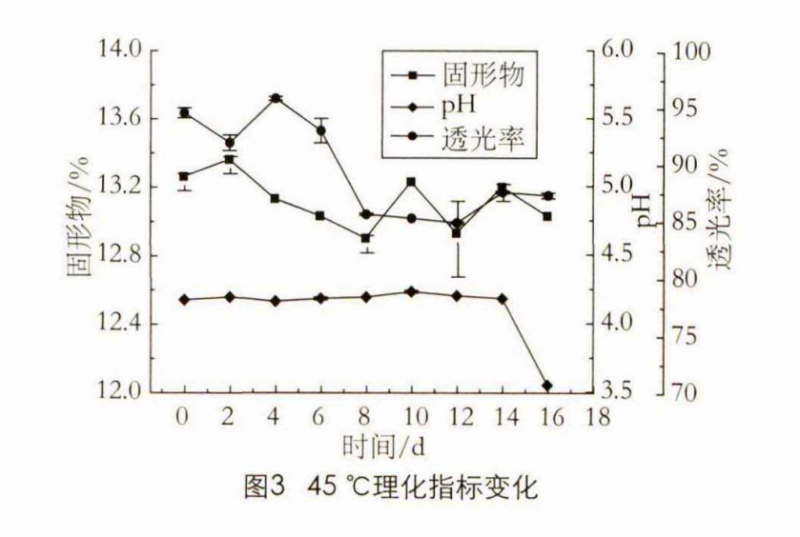 由圖2可知:在35 °C下 ,可溶性固形物含量在 13.47%? 12.80 % ,變化不明顯。隨著時(shí)間的延長(zhǎng)pH呈下降趨勢(shì),在第16天時(shí)降低明顯,降低至3.55。當(dāng)儲(chǔ)藏至 12、16 d, 透光率分別降低至91.33 %、90.73 %。綜合固形物、pH、透光率可知,青稞格瓦斯儲(chǔ)藏于35 °C下的貨架期為16 d。