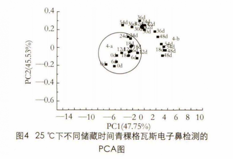 由圖4 可知:在 25 °C時(shí) ,第一、二主成分的貢獻(xiàn)度分別為 47.75 % 、45.53 % , 總貢獻(xiàn)率達(dá)93.28%。一般坐標(biāo)軸上貢獻(xiàn)率之和大于85 % , 便可以較好地反映整體的信息,即兩主成分包含了樣品的大部分信息。隨著儲(chǔ)藏時(shí)間的延長(zhǎng),樣品沿PC1軸向右,PC2軸先向下后向上,再向下分布。樣品儲(chǔ)藏在前24 d內(nèi),由于風(fēng)味未發(fā)生較大變化,所以在PCA圖上各點(diǎn)分布較為集中;當(dāng)樣品儲(chǔ)藏時(shí)間超過24 d,由于揮發(fā)性風(fēng)味發(fā)生較大變化,各點(diǎn)分布與儲(chǔ)藏24 d前形成的區(qū)域距離較遠(yuǎn) 。所 以 ,從風(fēng)味的角度可以反映出儲(chǔ)藏于 25 °C下,青稞格瓦斯在24 d左右風(fēng)味便發(fā)生較大變化,貨架期為24 d, 最優(yōu)為18 d。