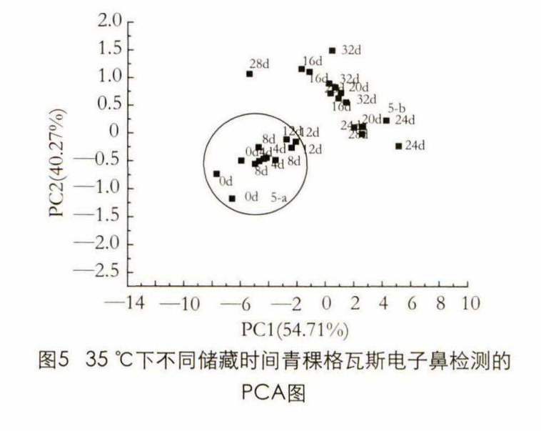 由圖5可知:在35 °C時(shí) ,第一、二主成分的貢獻(xiàn)度分別為 40.27 % 、54.71 % , 總貢獻(xiàn)率達(dá)94.98 % ,兩主成分基本上包含了樣品的大部分信息,隨著儲(chǔ)藏時(shí)間的延長(zhǎng),樣品沿PC1軸向右,PC2軸先向下后向上分布。樣品在12 d前各點(diǎn)分布集中,風(fēng)味變化不大,形成區(qū)域5-a; 12 d后各點(diǎn)在PCA圖譜上的分布與區(qū)域5-a距離較遠(yuǎn),風(fēng)味發(fā)生顯著變化。從風(fēng)味變化的程度基本可推斷在該溫度下的貨架期為12 d。