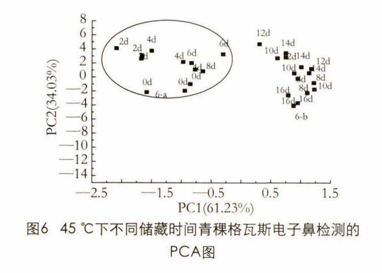 由圖6可知:在45 °C時(shí) ,第一、二主成分的貢獻(xiàn)度分別為 61.32 % 、34.03 % , 總貢獻(xiàn)率達(dá)95.35 % ,說明主成分可以將原始髙維矩陣數(shù)據(jù)的信息較好地反映出來。樣品在6 d前各點(diǎn)分布集中,風(fēng)味無明顯變化;6 d后各點(diǎn)在PCA圖譜上的分布與區(qū)域6-a距離較遠(yuǎn),風(fēng)味發(fā)生顯著變化。從風(fēng)味變化的角度分析,青稞格瓦斯儲(chǔ)藏在45 °C下貨架期為6 d。