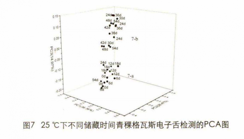 由圖7可知:隨著儲(chǔ)藏時(shí)間的延長(zhǎng),青稞格瓦斯電子舌響應(yīng)信號(hào)發(fā)生變化。在溫度為25 °C時(shí) ,第一、二、三主成分的貢獻(xiàn)度分別為 36.36 %、28.47 %、 14.97 % ,總貢獻(xiàn)率達(dá)79.8%, 3個(gè)主成分基本上包含了樣品的大部分信息。隨著儲(chǔ)藏時(shí)間的延長(zhǎng),樣品在PCA三維圖譜上延PC1與PC2構(gòu)成的底面由內(nèi)至外分布,延PC3軸由下至上分布。當(dāng)儲(chǔ)藏時(shí)間在18 d之前,各樣品在PCA圖譜上分布集中,形成三維區(qū)域7-a。18 d后各點(diǎn)與三維區(qū)域7-a距離較遠(yuǎn)且較為分散。所以,從滋味的角度可以反映出儲(chǔ)藏于25 °C下 ,青稞格瓦斯在18 d左右便發(fā)生較大變化,貨架期為18 d。